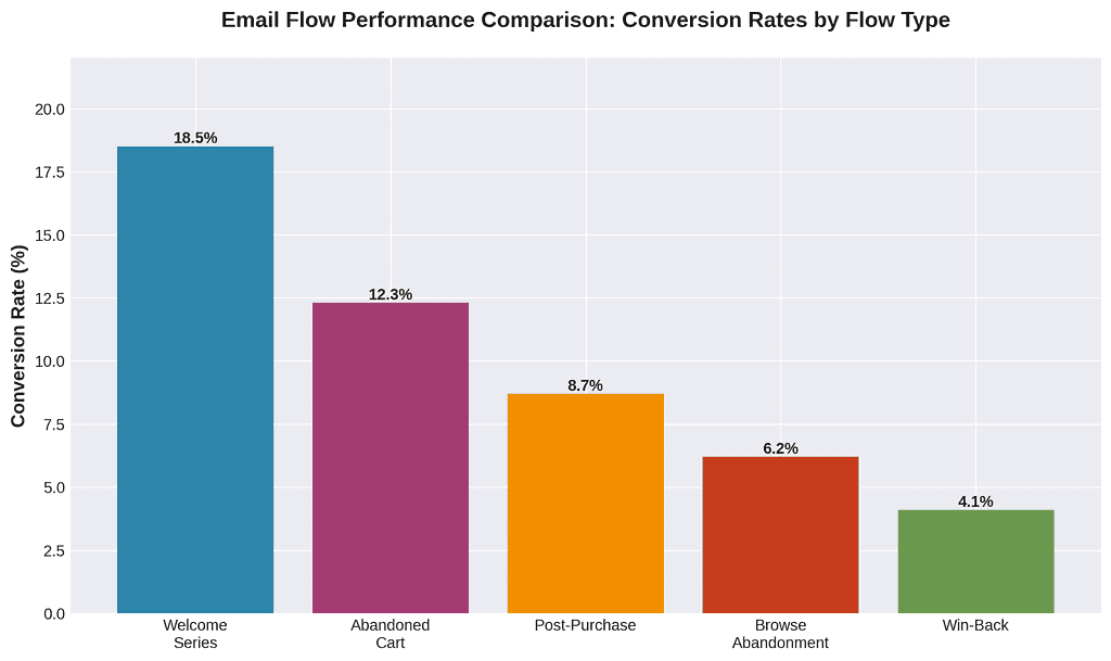 Conversion Rate by Email Type: Don’t just track overall conversion rates. Measure separately for welcome series, abandoned cart, post-purchase, promotional campaigns, and browse abandonment. This reveals which email types need optimization.