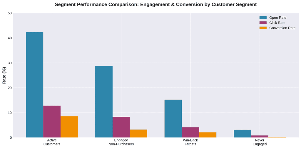 Week 5: Implement behavioral segmentation. Create three segments: Active customers, Engaged non-purchasers, Win-back targets. Build separate campaign calendars for each.