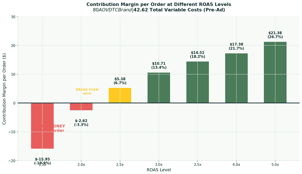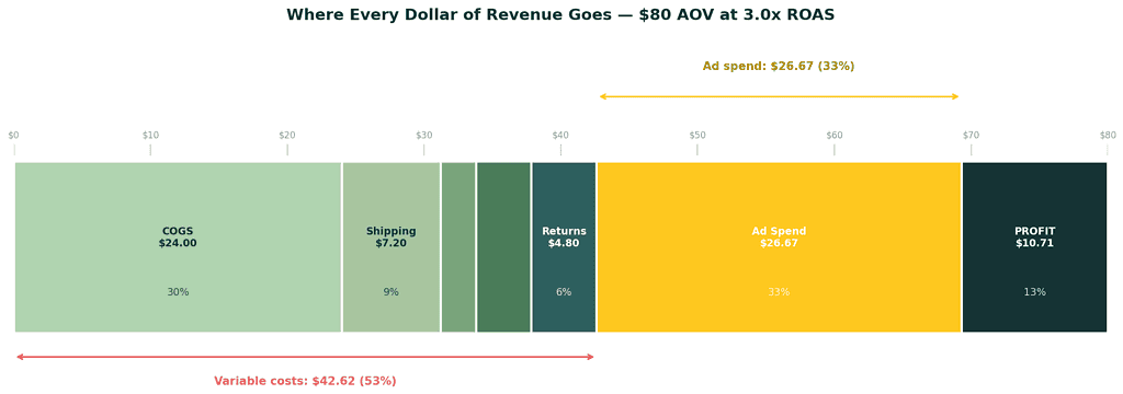 Let's run the math for a typical DTC brand at $80 AOV running at 3.0x ROAS: