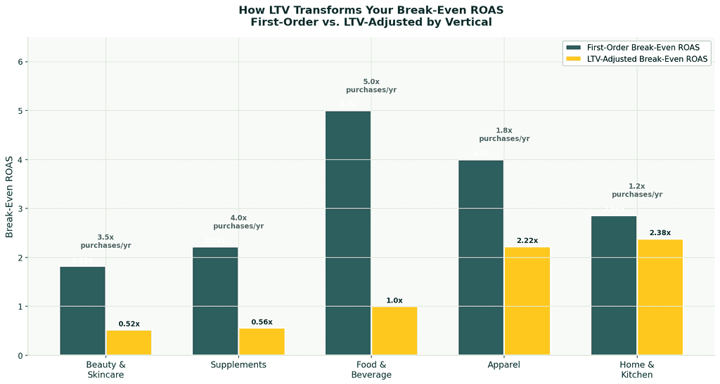 LTV-Adjusted Break-Even ROAS = First-Order Break-Even / Average Purchase Frequency