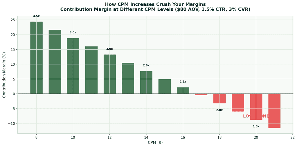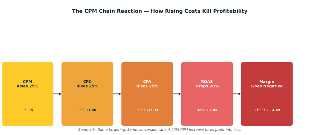 A 25% CPM increase doesn't just cost 25% more — it can push a profitable campaign below break-even entirely. Same ads, same targeting, same conversion rate.
