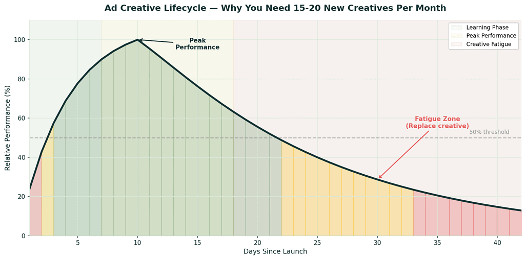 The average Meta ad creative peaks within 7-10 days and hits fatigue by week 3. Brands scaling past $100K/month need 15-20 new creatives per month just to maintain performance.