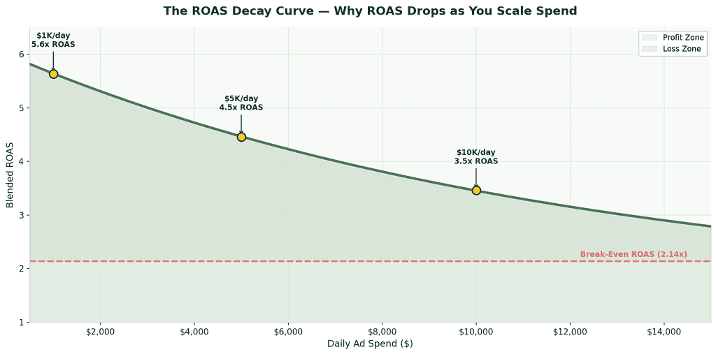 Here's the uncomfortable truth: as you increase ad spend, ROAS almost always declines. This isn't failure — it's physics.