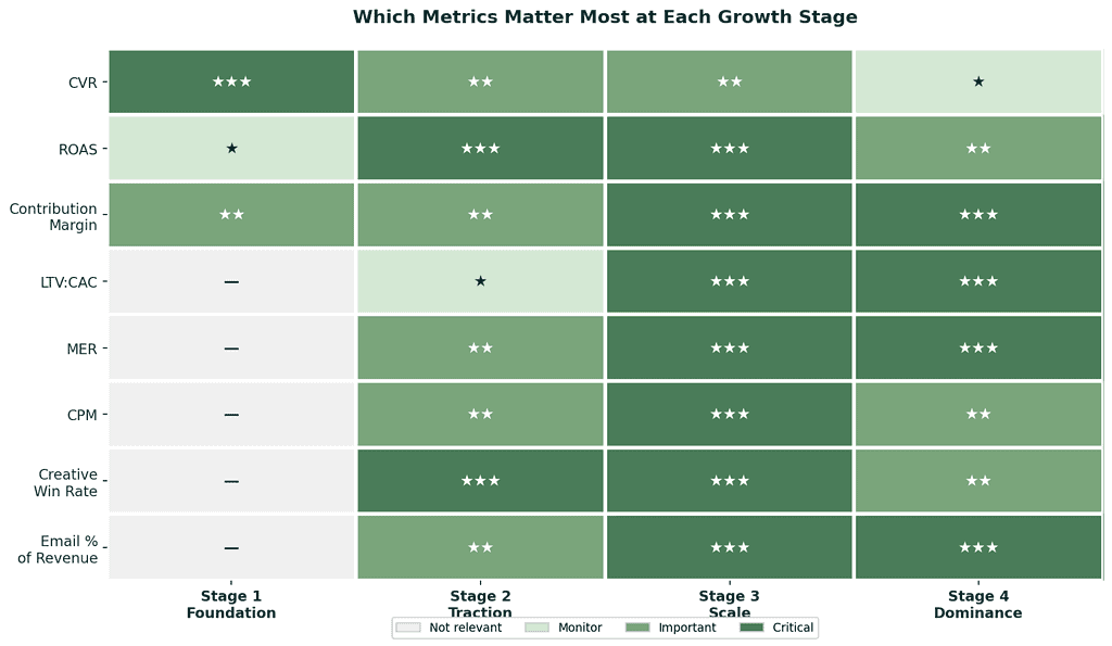 Different metrics matter at different stages. Here's the master framework — what to obsess over at each level: