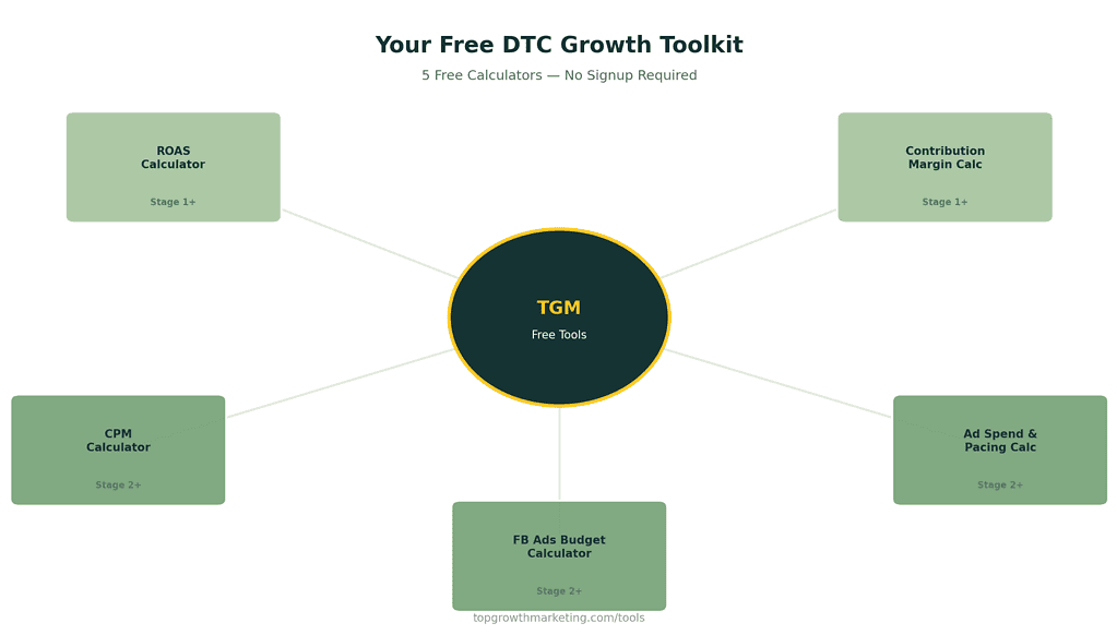 We built these tools specifically for DTC brands — no signup, no email gate. They're the same calculators we use with our clients to model unit economics at every growth stage: