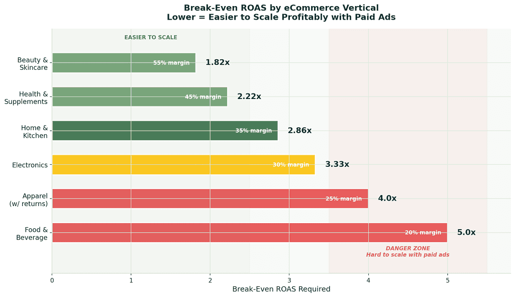 This is why ROAS alone is misleading. A 2.0x ROAS can be profitable for a high-margin beauty brand (55% net margin = 1.82x break-even ROAS) but devastating for a food brand (20% net margin = 5.0x break-even ROAS).