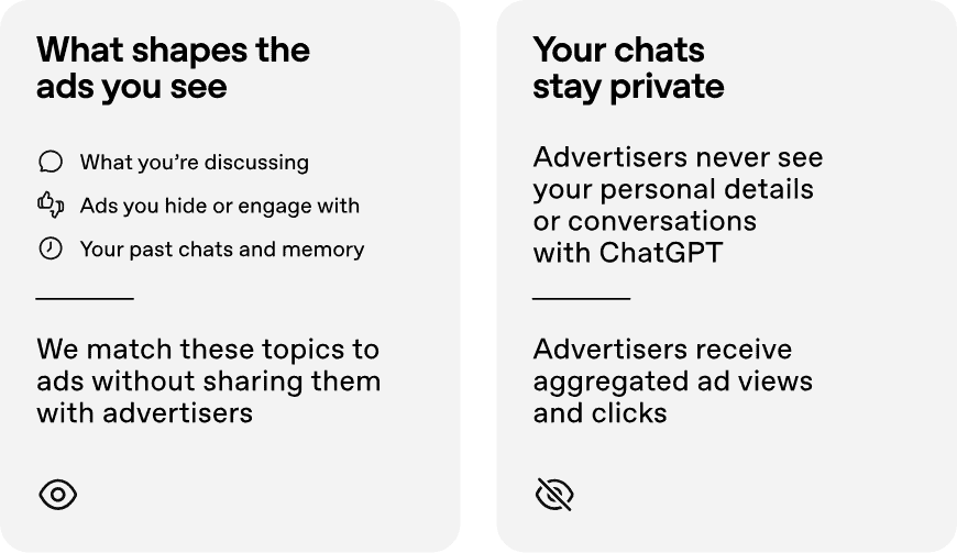 - Advertisers get zero access to conversation data. Your measurement strategy will depend on aggregated signals and downstream attribution, not audience profiling.