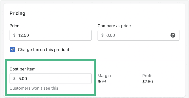 How it works: Enter your inventory cost here, and Shopify automatically calculates your margin and gross profit for every sale.